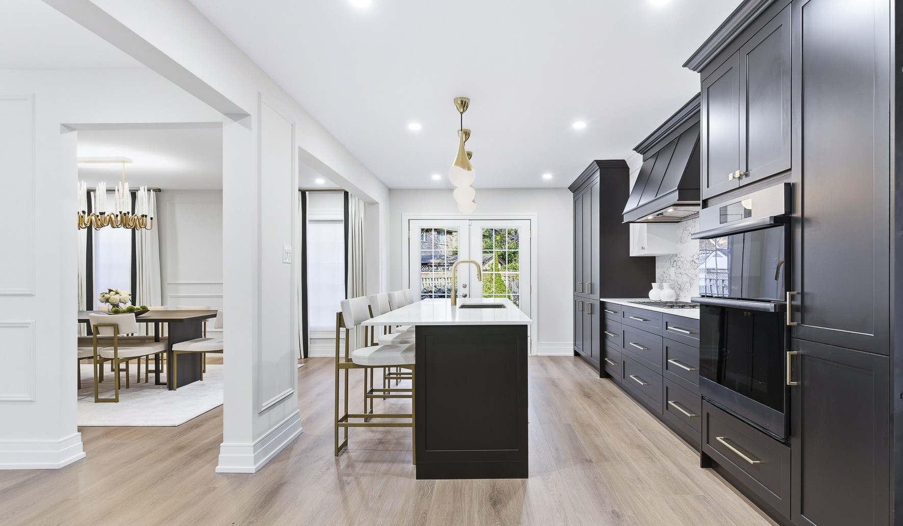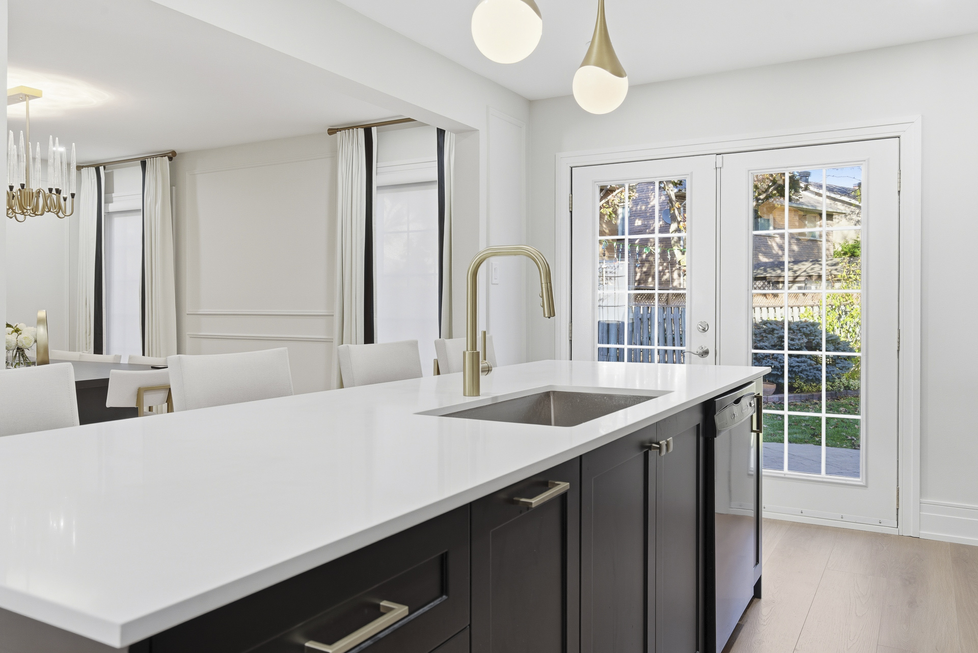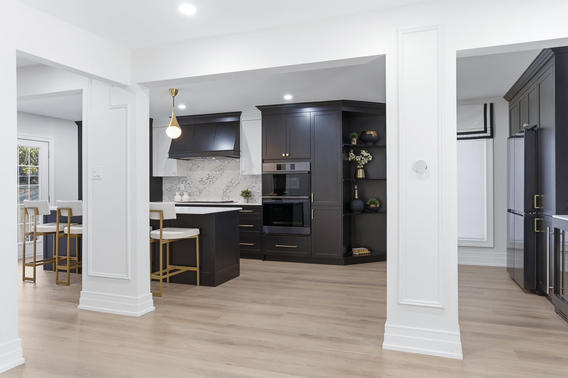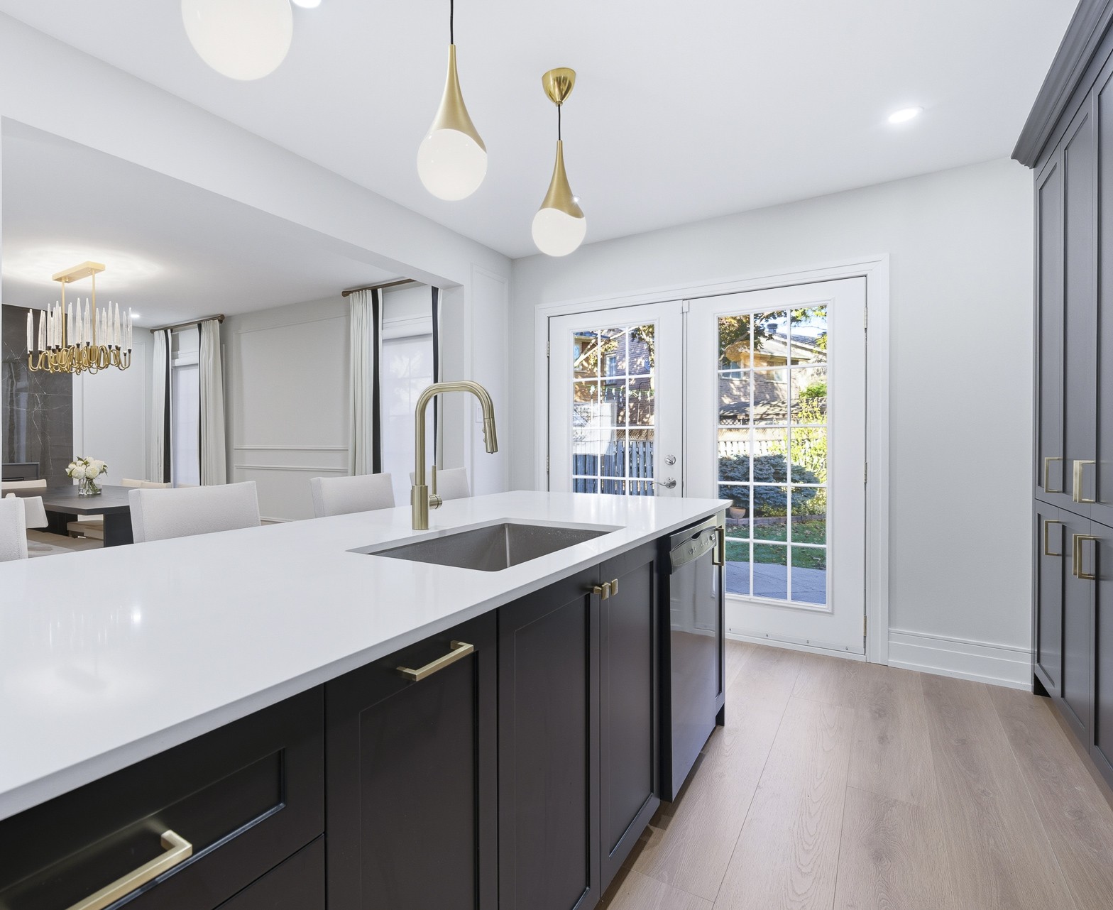 We also created a beautiful new kitchen and powder room, revamped the staircase, and added sophisticated trim work throughout. The end result is a revitalised space that Jackie and Nick absolutely love.