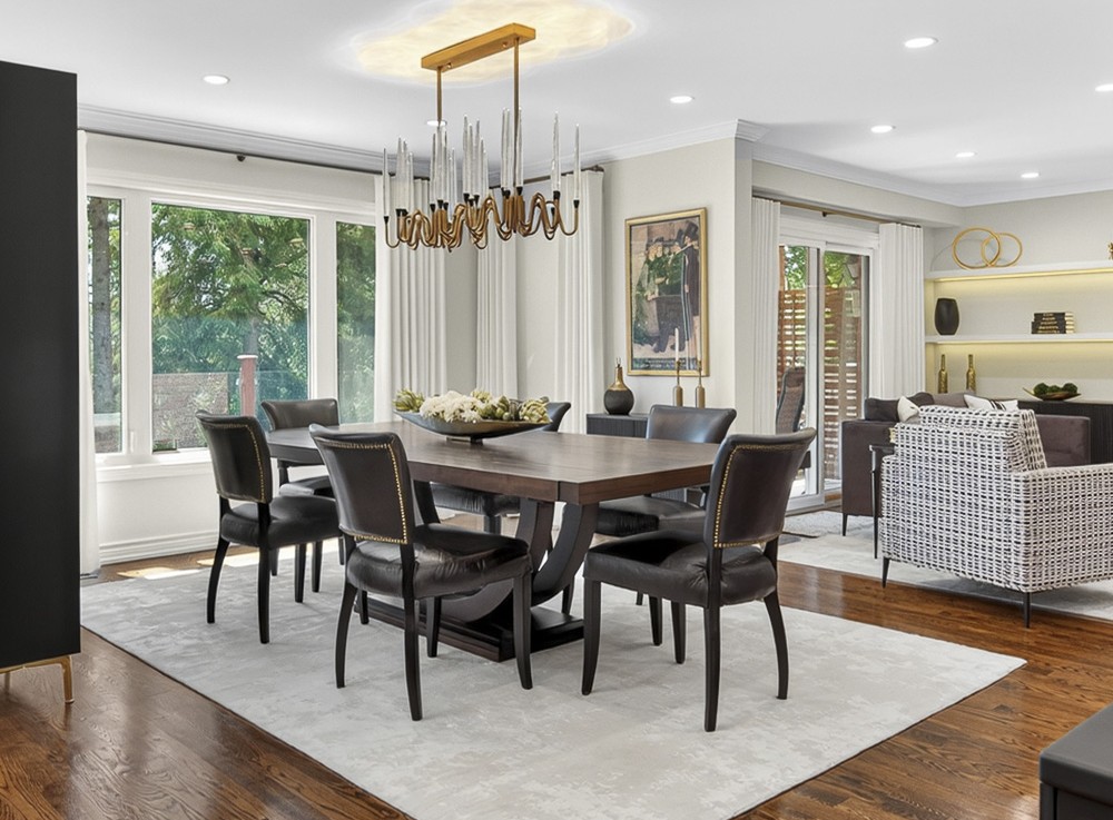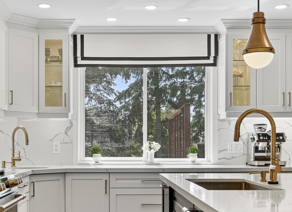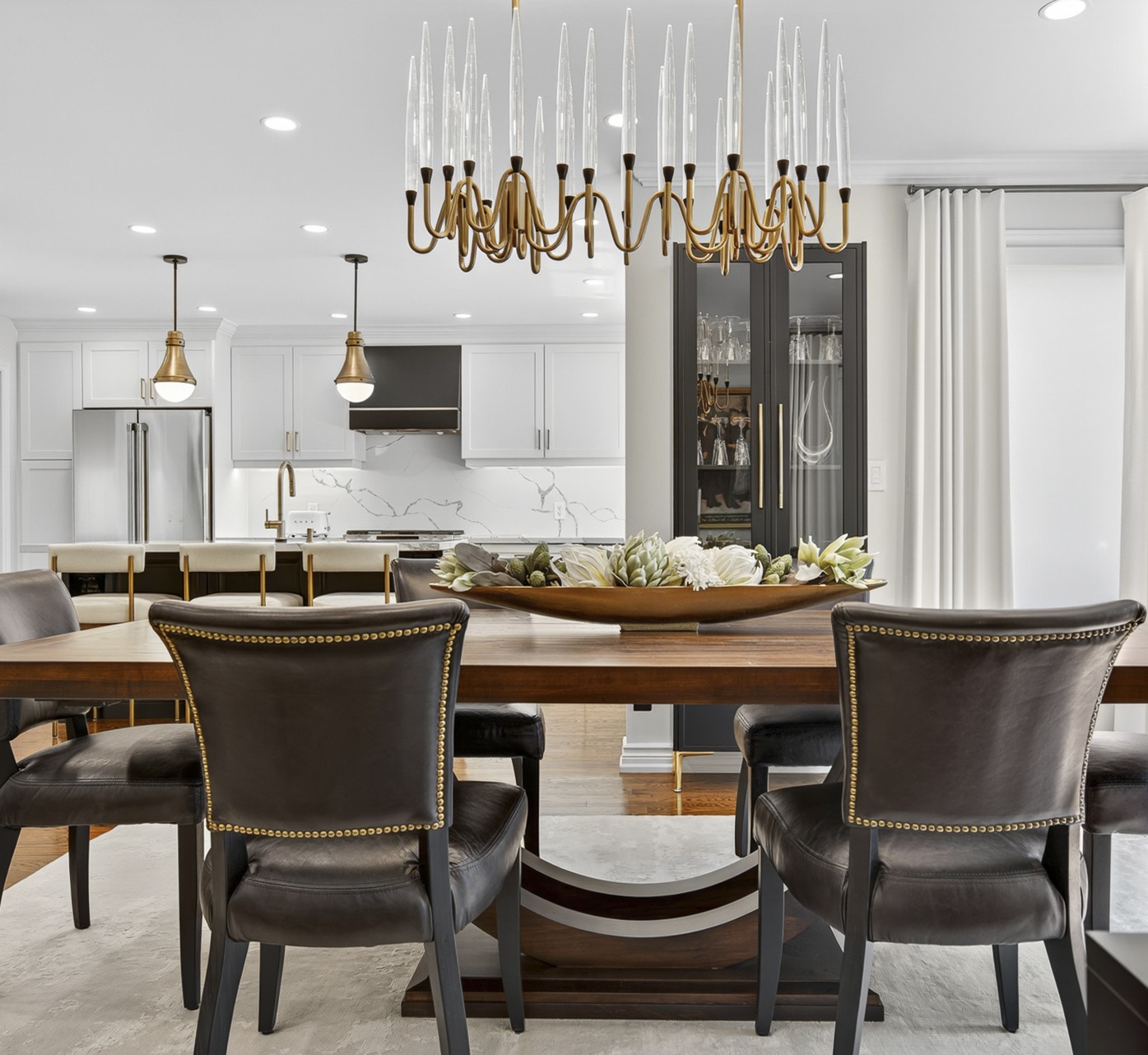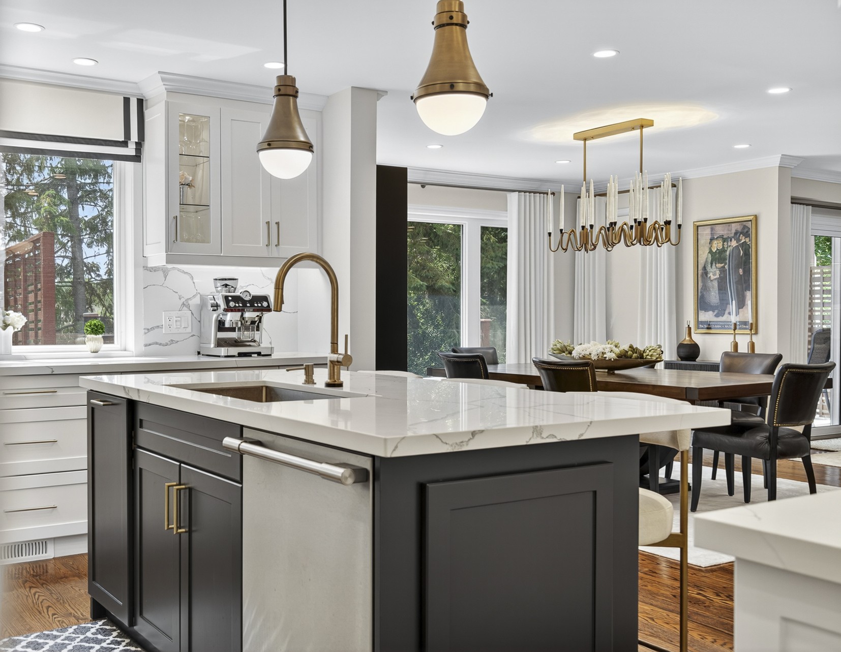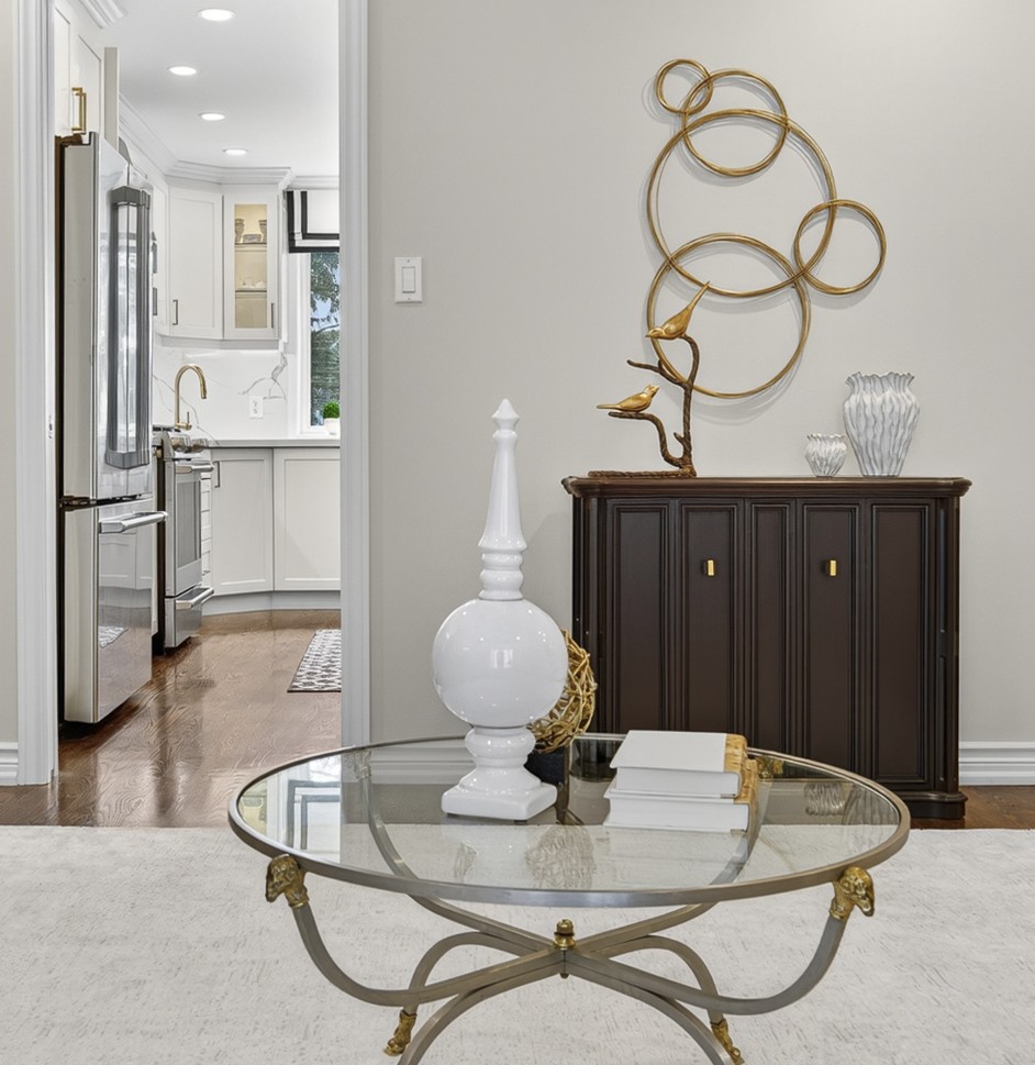 Kathy and Rene’s kitchen update soon grew into a full main floor transformation. Our approach centered on a neutral color palette, detailed trim, elegant drapery, and bold lighting. This set the stage for a reimagined kitchen and a striking living room feature wall, complete with a porcelain fireplace, floating cabinets, and backlit shelving. Refined window treatments and expertly selected furnishings completed the elegant Modern Classic look.