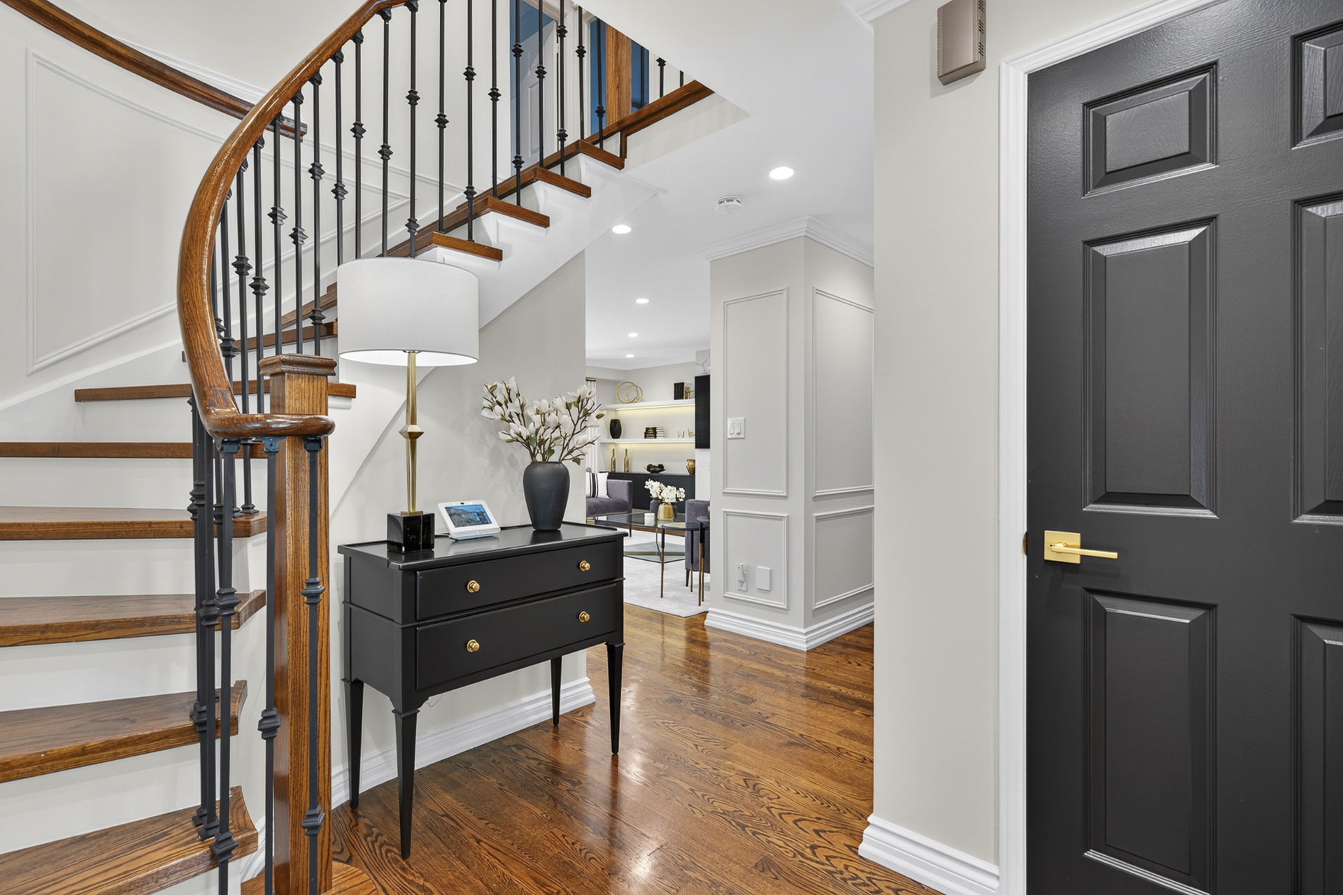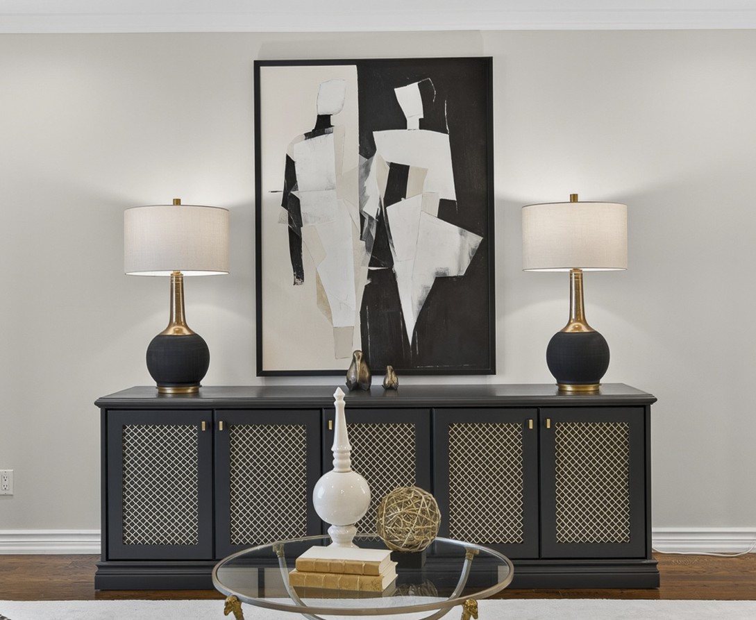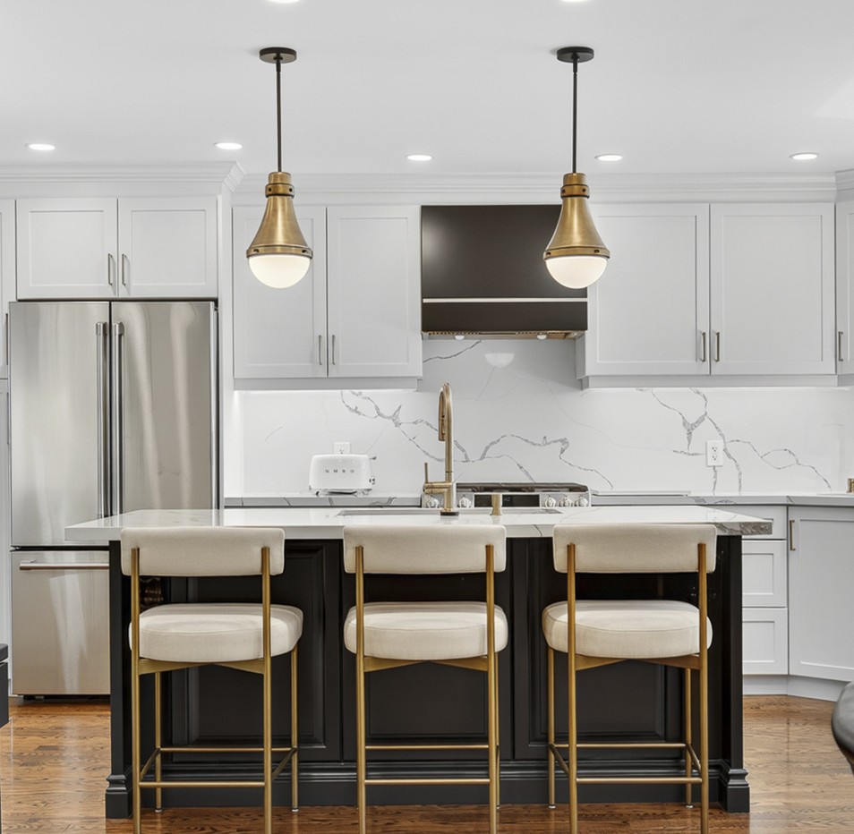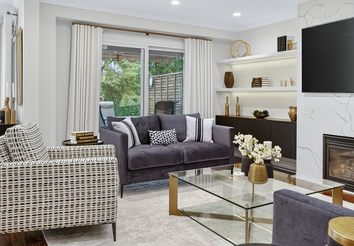 Kathy and Rene’s kitchen update soon grew into a full main floor transformation. Our approach centered on a neutral color palette, detailed trim, elegant drapery, and bold lighting. This set the stage for a reimagined kitchen and a striking living room feature wall, complete with a porcelain fireplace, floating cabinets, and backlit shelving. Refined window treatments and expertly selected furnishings completed the elegant Modern Classic look.