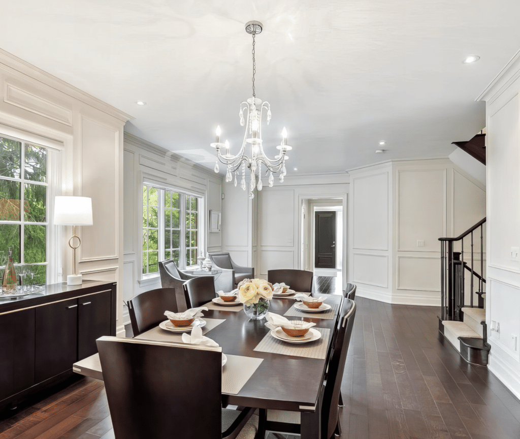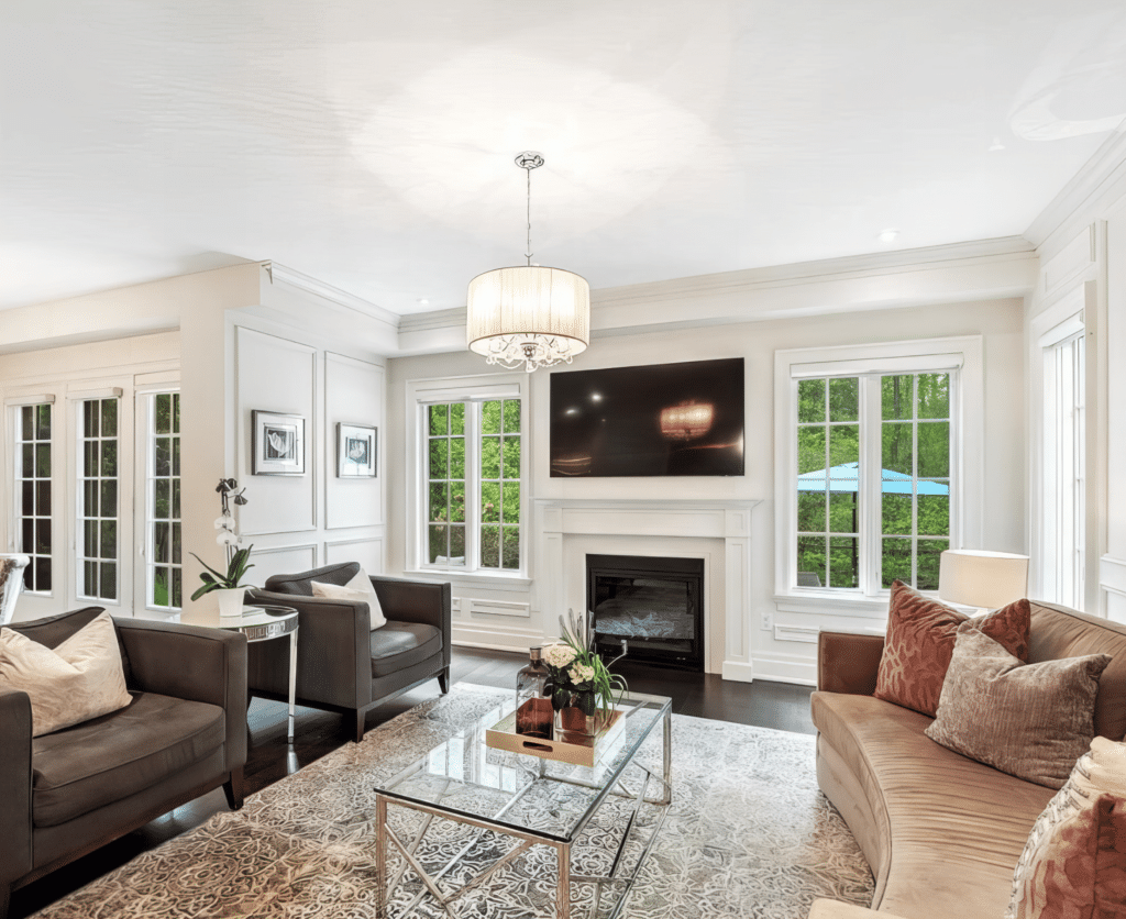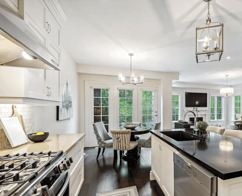 After purchasing a new townhome, our client enlisted us to elevate the kitchen, living, dining, and hallway spaces. Upgraded casings, baseboards, crown molding, a newly renovated kitchen, and a new fireplace set the tone. Carefully curated furniture and lighting created a sophisticated, cohesive design.
