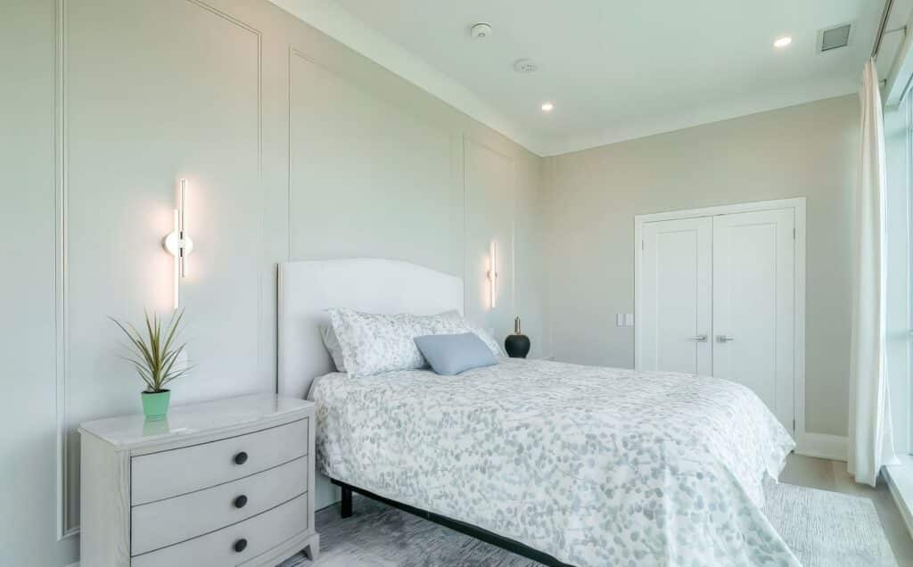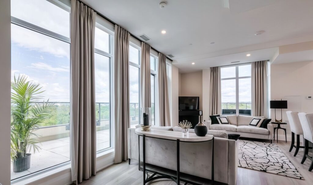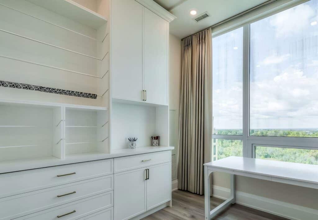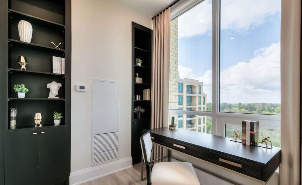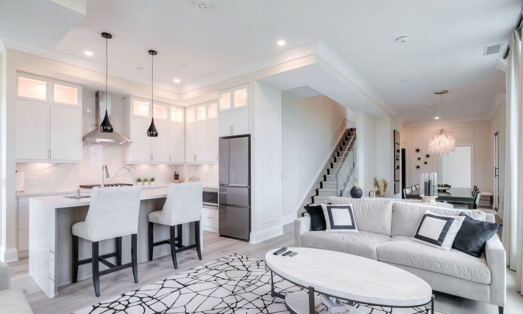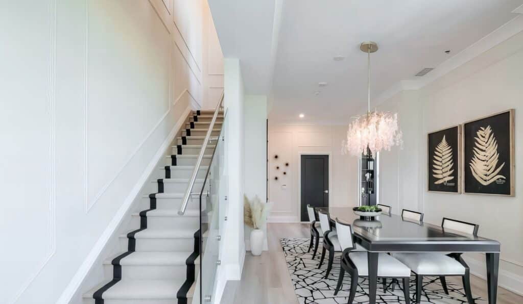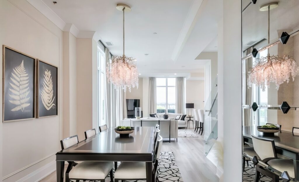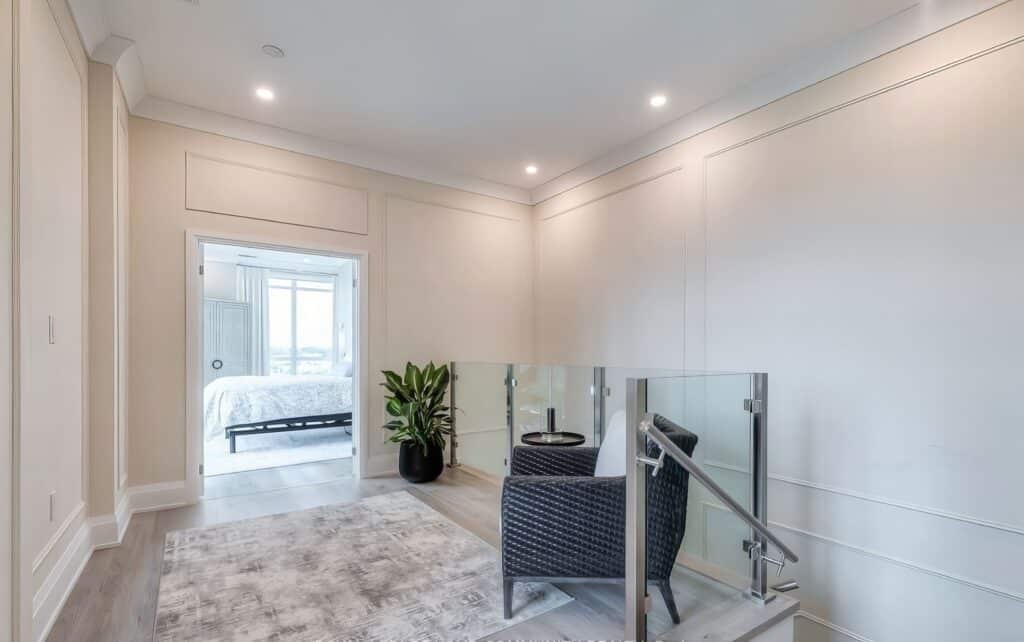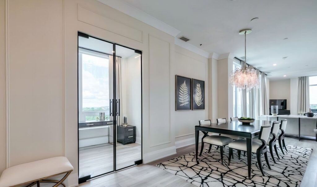 Our client wanted a luxurious sanctuary in their new two-story condo. We designed and renovated the space, upgrading lighting with pots, chandeliers, and sconces, and added refined window treatments and furniture. Wall trim, glass office doors, custom cabinetry, and kitchen and bathroom improvements brought a sense of timeless comfort and style.